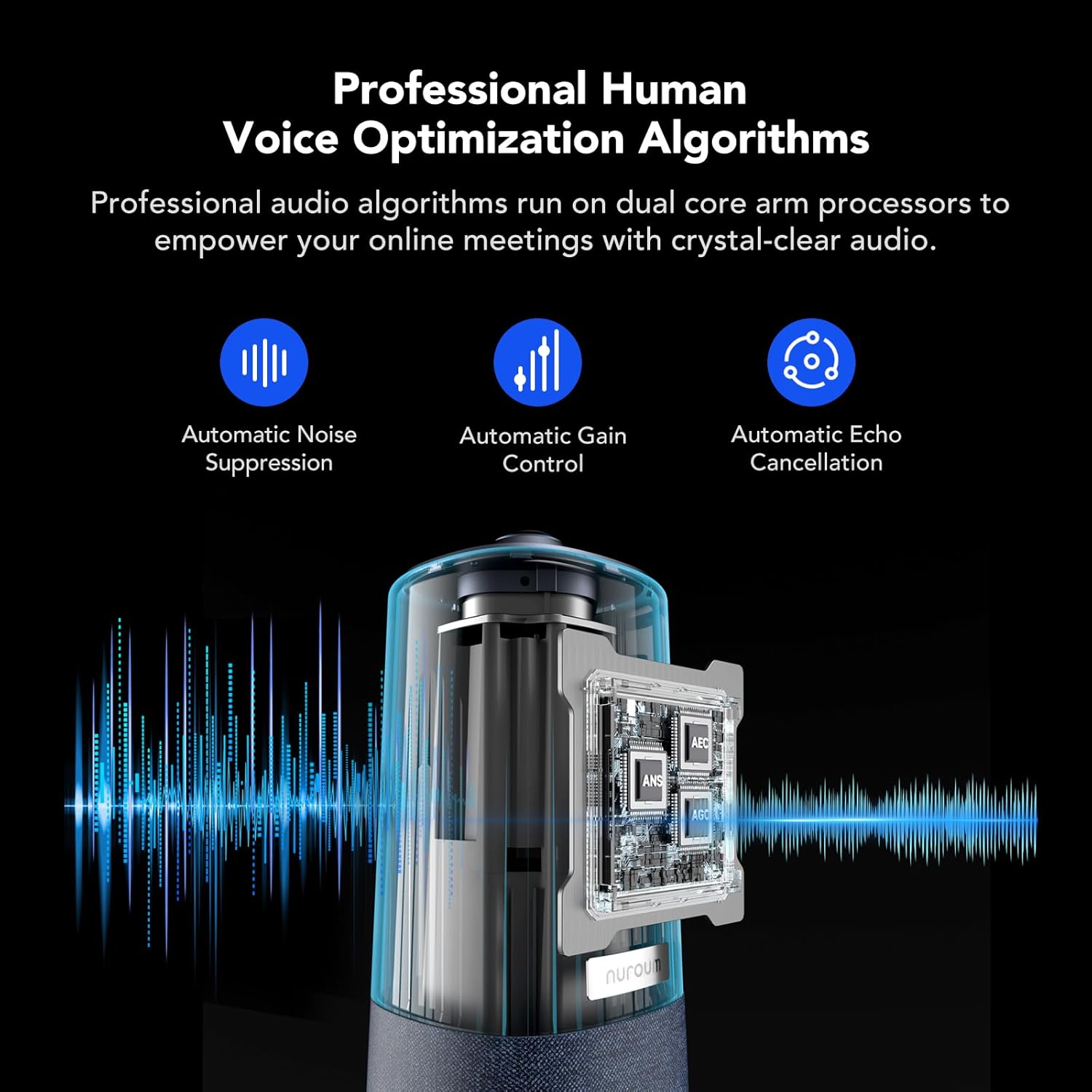 No se puede ignorar la importancia del audio en las videollamadas, y aquí es donde la Nuroum Webcam brilla intensamente. Con seis micrófonos omnidireccionales y un altavoz full-duplex, el sonido es tan claro como el video. Los micrófonos son capaces de captar audio desde cualquier dirección, incluso a una distancia de hasta 5 metros. Esto significa que, aunque haya varias personas en la sala, todos podrán ser escuchados sin problemas, mientras que los ruidos de fondo se minimizan gracias a su tecnología de reducción de ruido y el algoritmo de eliminación de reverberación.