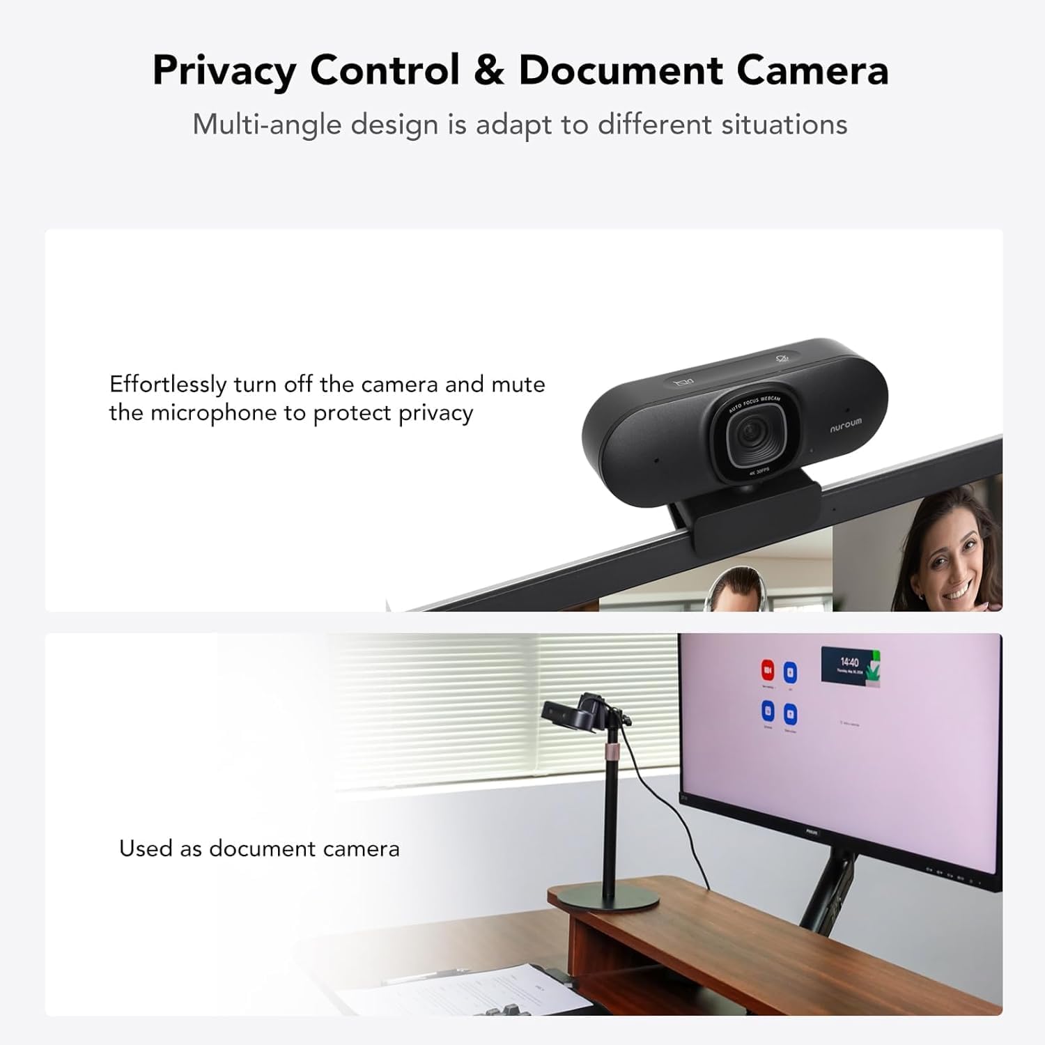 – La cámara web ofrece una resolución de 4K UHD y soporta videollamadas a 1080P a 60fps, lo que garantiza imágenes nítidas y fluidas.