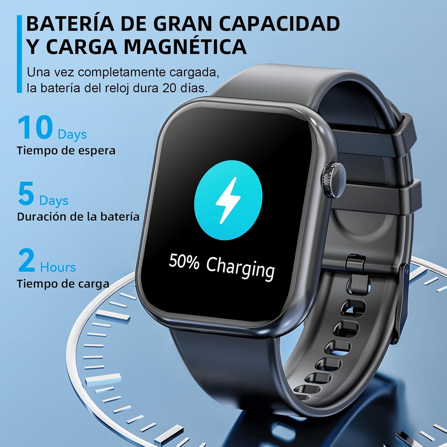 Uno de mis temores al usar un smartwatch era la duración de la batería. Sin embargo, este modelo está diseñado para durar entre 1 a 3 días con uso normal y hasta 10 días en espera. Esto significa que no tengo que estar cargándolo a diario, lo que es muy conveniente. Además, su clasificación IP67 resistente al agua me da tranquilidad al usarlo durante el ejercicio o incluso cuando me lavo las manos.