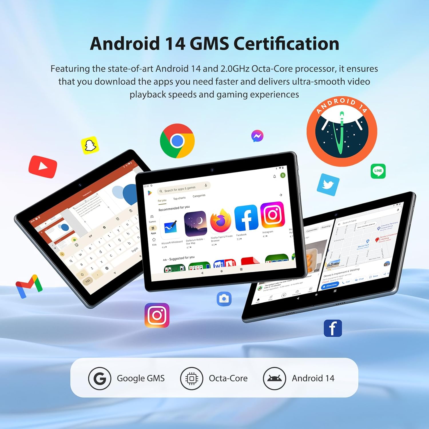 La Tablet 10 Pulgadas Android 14 está equipada con el último sistema operativo Android 14, y su procesador octa-core garantiza que cada tarea se complete sin esfuerzo. Esta tablet ha pasado las certificaciones de Google GMS y WideVine L1, lo que significa que puedo disfrutar de mis películas y programas favoritos en plataformas como YouTube y Netflix con una calidad impresionante. Además, puedo descargar y usar millones de aplicaciones a través de la Play Store, lo cual es un gran punto a su favor.