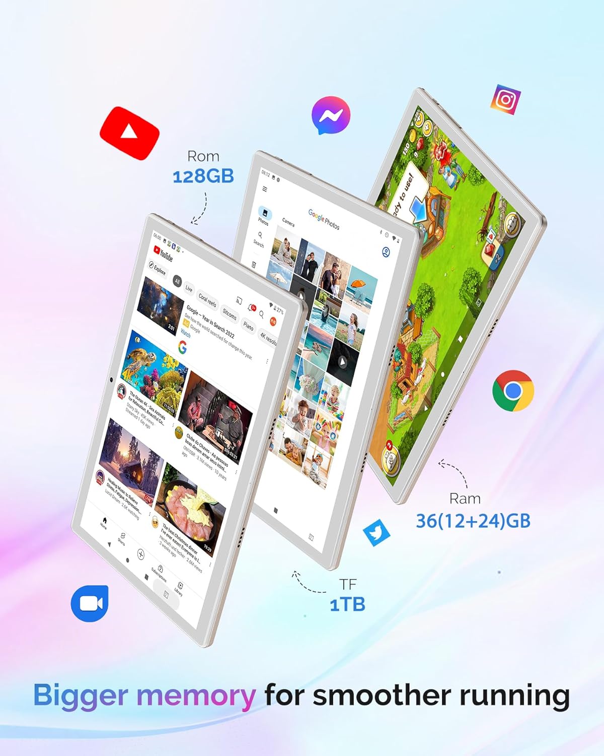 La potencia es otra de las grandes fortalezas de esta tablet. Equipado con un procesador octa-core de 2.0 GHz y 36 GB de RAM (12 GB + 24 GB), la PIXPEAK maneja múltiples aplicaciones y tareas con facilidad. No experimentarás esos frustrantes tiempos de carga o bloqueos que a menudo se presentan con dispositivos de menor capacidad. La combinación de 128 GB de ROM, ampliable hasta 1 TB, asegura que tendrás suficiente espacio para almacenar todas tus fotos, videos y aplicaciones.