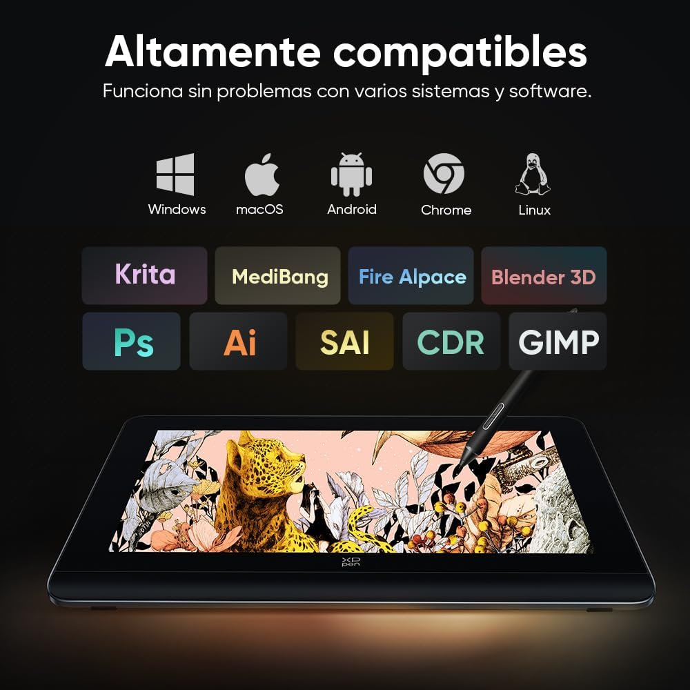 Algo que no puedo dejar de mencionar es la compatibilidad de la XPPen Pro16(Gen2). Funciona perfectamente con Windows 7 (y versiones posteriores), macOS 10.10, Android, Chrome OS y incluso Linux. Esto me permitió conectar la tableta a varios dispositivos, incluyendo mi portátil y mi teléfono móvil, sin complicaciones. Si eres un usuario de software como Adobe Photoshop, Illustrator, Krita, o incluso Blender3D, esta tableta soporta todos estos programas, haciendo que la integración sea uno de los aspectos más sencillos de mi flujo de trabajo.
